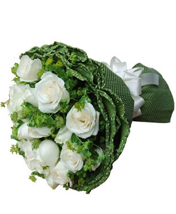 商品簡介:白玫瑰11枝 葉上黃金(配花) 商品包裝:墨綠色卷邊紙圓形包裝