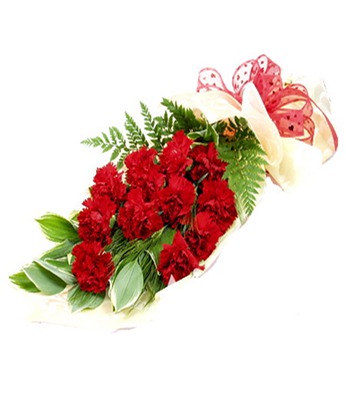 商品簡介:紅色康乃馨12枝 綠葉 黃鶯 商品包裝:皺紋紙扇形包裝