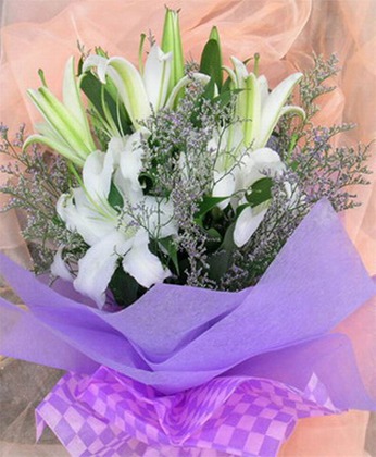 商品簡介:白色多頭百合5枝 情人草 綠葉 商品包裝:淡紫色棉紙圓形包裝