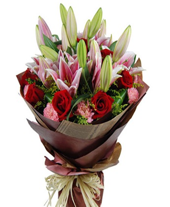 商品簡介:紅玫瑰10枝 粉色康乃馨10枝 粉色多頭百合3枝 滿天星(配花) 黃鶯(配花) 巴西葉(配花) 商品包裝:深色皺紋紙圓形高檔包裝