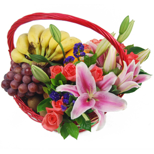 3支粉香水百合+12支粉玫瑰+香蕉+橙子+提子+奇異果;其中左面放鮮花,右面放水果