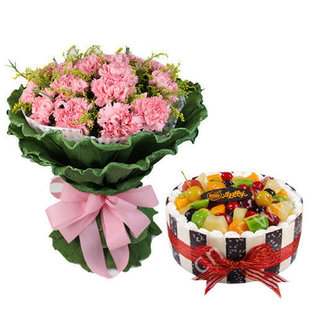 商品簡介:19朵粉色康乃馨,綠色卷邊紙圓形包裝,8寸水果蛋糕