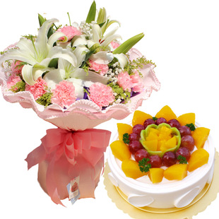 商品簡介:花材:11枝粉色康乃馨+3枝白色多頭香水百合,搭配黃鶯滿天星 包裝:粉色卷邊紙包裝,搭配粉色蝴蝶結 蛋糕:8水果蛋糕