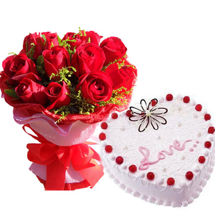 花材:11枝紅玫瑰,搭配黃鶯 蛋糕:10寸心型鮮奶蛋糕