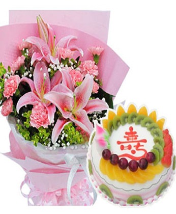 粉色多頭百合1枝 粉色康乃馨12枝 滿天星(配花) 黃鶯(配花) 8寸圓形鮮奶水果蛋糕 蛋糕上寫(xiě)一個(gè)大紅色的壽字
