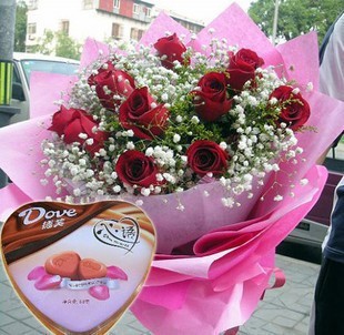 紅玫瑰11支加星草豐滿粉色手揉紙尖角包裝圓形花束。 德芙心語巧克力98克裝心形禮盒。