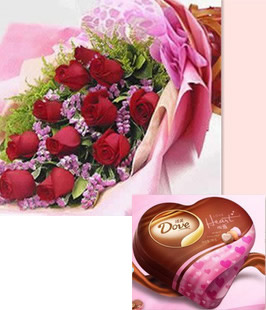 商品簡介:11朵紅玫瑰+點綴配花配草 AND 德芙心型巧克力(98g)