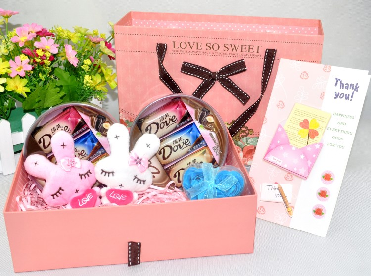 商品簡介:2盒德芙碗裝巧克力(口味任意選擇) 可愛美麗兔公仔一對 大號精美禮盒 精美的玫瑰花禮盒(顏色隨機發)