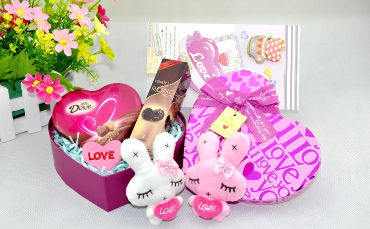 材料包裝: 1條意大利進口費列羅(金莎、慕朗、拉斐爾三口味隨機一種) 1盒德芙心印巧克力(凈含量53g) 可愛美麗兔公仔一對 精美禮盒+禮品袋