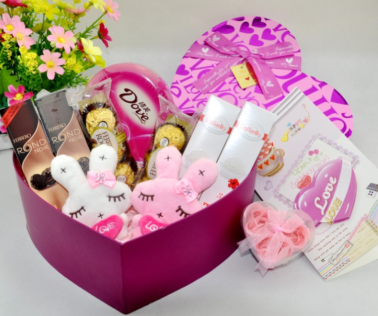 6條意大利進(jìn)口費(fèi)列羅(金莎、慕朗、拉斐爾三口味隨機(jī)發(fā)) 1盒德心語(yǔ)巧克力(凈含量:98g) 可愛的美麗兔公仔一對(duì) 大號(hào)精美禮盒+禮品袋 精美的玫瑰花禮盒(紅色與粉色隨機(jī)發(fā))