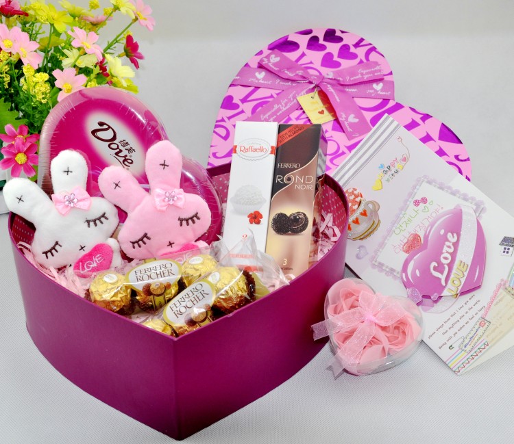 4條意大利進口費列羅(金莎、慕朗、拉斐爾三口味隨機發) 1盒德心語巧克力(98g) 可愛的美麗兔公仔一對 大號精美禮盒 精美的玫瑰花禮盒(紅色與粉色隨機發)