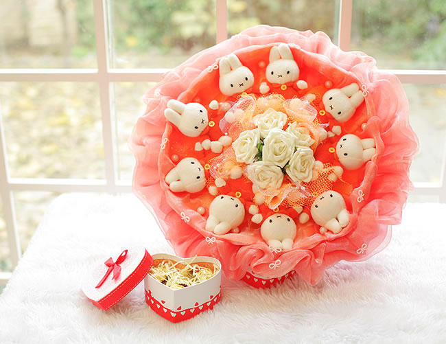 9只米菲兔,3顆巧克力,6朵仿真花。 高約35cm, 寬約35cm 顏色:橘色