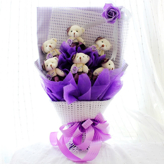 材料包裝: 6只高12CM的粘鉆泰迪熊 高60cm,直徑45cm左右. 穿衣服帶帽子. 顏色:紫色