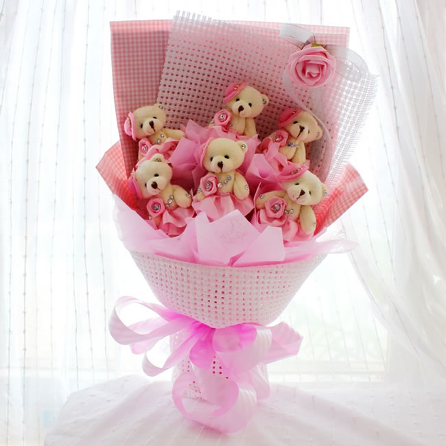 商品簡介:6只高12CM的粘鉆泰迪熊 高60cm,直徑45cm左右. 穿衣服帶帽子. 顏色:粉色