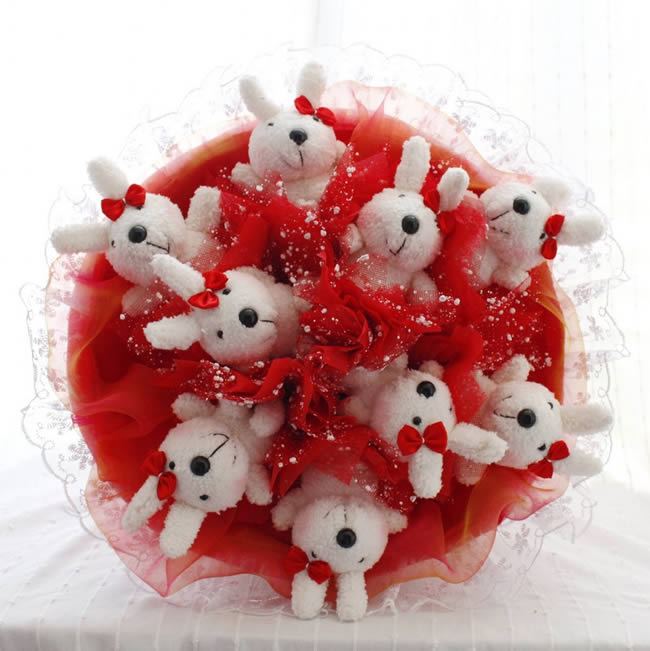 材料包裝: 9只韓國(guó)白兔,蕾絲款,高40cm,直徑45cm左右花 語: 驚喜,新奇,五顏六色的愛。 顏色:紅色