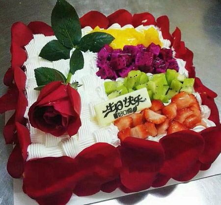 商品簡介:方形鮮奶水果蛋糕,水果鋪面,玫瑰花瓣圍邊