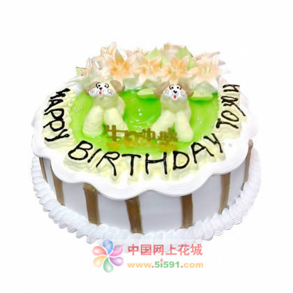 | 材料包裝: | 圓形卡通鮮奶蛋糕,綠色果醬,中間做兩只小狗,奶油花,巧克力片裝飾 | | 相關花語: | 如果人生的風景有無數,愿幸福高居生活的榜首;如果情感的歷程長而久,愿快樂領跑在最前頭!您的生日,有我們的祝福相伴左右!