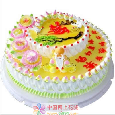 商品簡介:雙層水果蛋糕,中間夾心水果,表面壽公裝飾,蛋糕尺寸:10寸+6寸