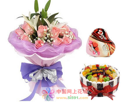 材料包裝: 粉玫瑰12枝 白色多頭百合2枝 滿天星 黃鶯;8寸水果糕;外加德芙巧克力109克