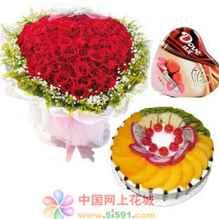 材料包裝: 99枝紅玫瑰(心型),外圍滿天星、黃鶯;8寸水果蛋糕 外加德芙巧克力109克