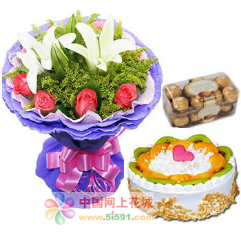 9支粉玫瑰,1支多頭百合,滿天星黃鶯;10寸水果蛋糕 (時令水果)外加費列羅巧克力16粒裝,凈含量200G