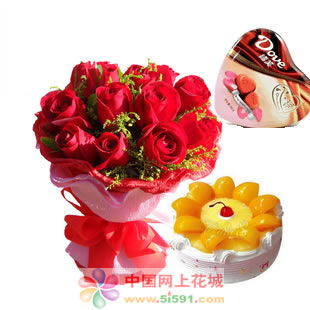 11枝紅玫瑰,搭配黃鶯;10寸鮮奶水果蛋糕 外加德芙巧克力109克