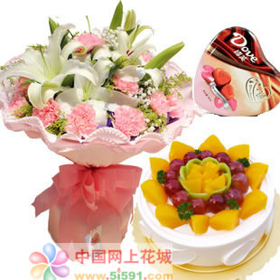 11枝粉色康乃馨+3枝白色多頭香水百合,搭配黃鶯滿天星 8水果蛋糕;外加德芙巧克力109克