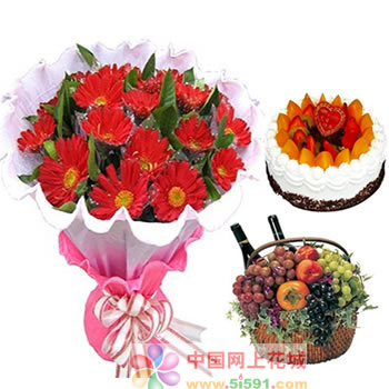 材料包裝: 18枝大紅色扶郎花;10寸圓形水果蛋糕;青提、紅提、黑提,柿子、油桃、蘋果、香梨等時令水果墊底,綠葉外圍點綴;外加兩瓶長城750ML干紅