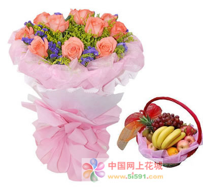 粉玫瑰11枝 滿天星;果籃:紅提香蕉火龍果蘋果菠蘿橘子獼猴桃