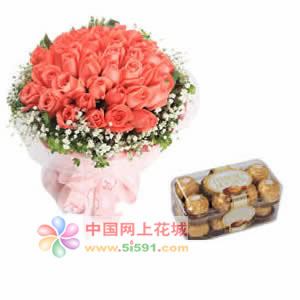 商品簡(jiǎn)介:33枝粉玫瑰+黃鶯+滿天星;外加費(fèi)列羅巧克力16粒裝,凈含量200G