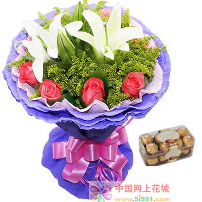 商品簡介:9支粉玫瑰,1支多頭百合;外加費(fèi)列羅巧克力16粒裝,凈含量200G