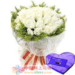 21枝白玫瑰+黃鶯;外加德芙巧克力109克