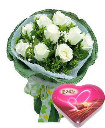 9支白玫瑰 加巴西葉情人草搭配;外加德芙巧克力98克