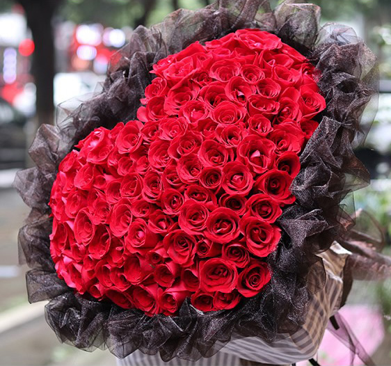 99支紅玫瑰,心型包裝,黑色網(wǎng)紗包裝