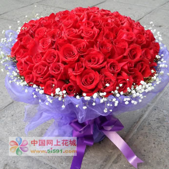 99支紅玫瑰 滿天星圍邊 紫色紗紙包裝
