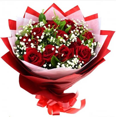16朵紅玫瑰、滿天星、黃鶯、綠葉搭配;包裝:白色綿紙內襯,紅色綿紙外圍.紅色絲帶扎束