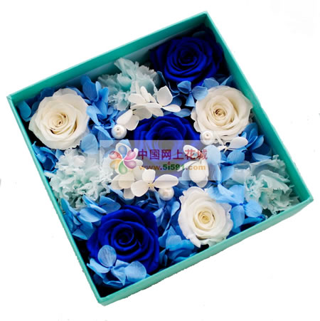 商品簡介:主材:藍色玫瑰3朵(4-5CM直徑),白色玫瑰3朵(3-4CM直徑); 配材:藍色康乃馨,藍色繡球; 尺寸:長15*寬15*高7.5CM
