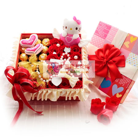 產品包含:18朵香皂花,1只KT貓,18顆費列羅巧克力以及其他裝飾。 禮盒尺寸:長122*寬22*高10CM