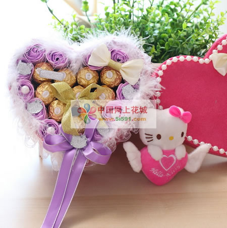 產品包含:15朵香皂花,10顆費列羅巧克力,一只天使KT貓公仔 禮盒尺寸:長22*寬19*高9CM