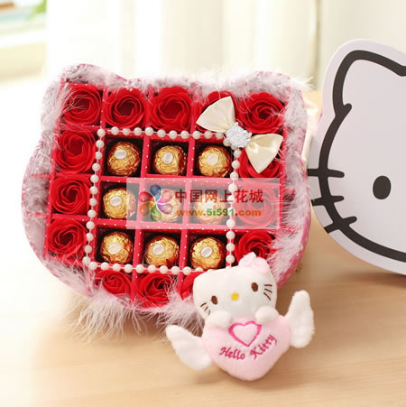 產(chǎn)品包含:14朵香皂花,9顆費列羅巧克力,一只天使KT貓公仔 禮盒尺寸:長22*27CM