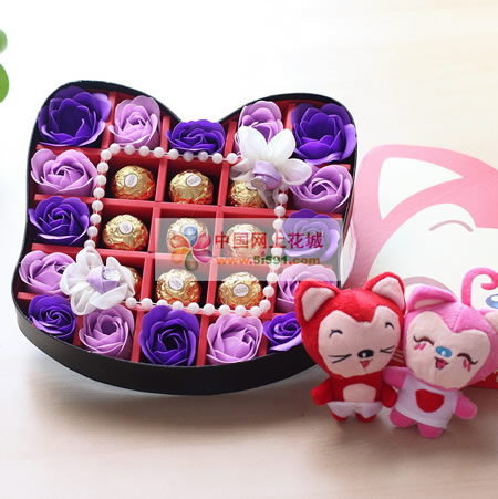 產品包含:16朵香皂花,9顆費列羅巧克力,一只天使KT貓公仔 禮盒尺寸:長23CM*寬23CM