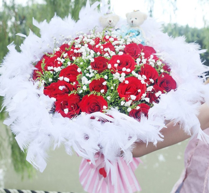 21支紅玫瑰+2個小熊,精美花結,羽毛包裝。