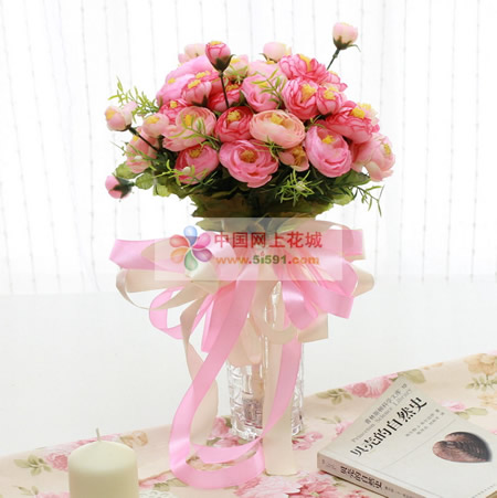 商品簡介:粉色(仿真花)茶玫手捧花,,采用高仿真材質(zhì),手感柔軟,絲帶搭配包裝。整個(gè)花束高30CM,直徑25CM左右