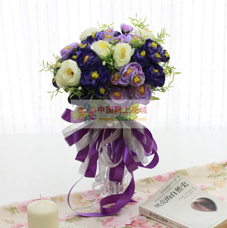 商品簡介:藍(lán)紫色(仿真花)茶玫手捧花,,采用高仿真材質(zhì),手感柔軟,絲帶搭配包裝。整個花束高30CM,直徑26CM左右。