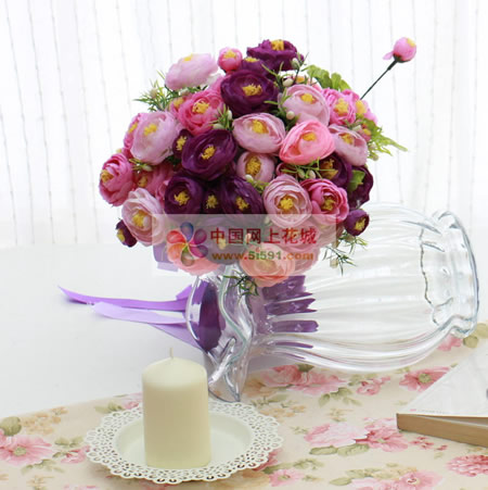 商品簡介:紫粉色(仿真花)茶玫手捧花,,采用高仿真材質(zhì),手感柔軟,絲帶搭配包裝。整個花束高30CM,直徑28CM左右