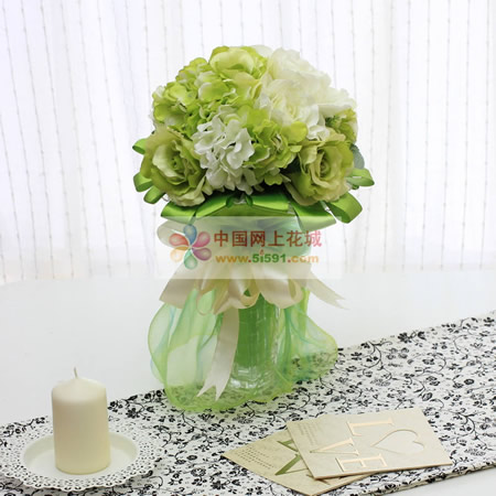 綠色繡球(仿真花)玫瑰手捧花,采用高仿真材質,手感柔軟,絲帶搭配包裝。整個花束高30CM,直徑27CM左右。