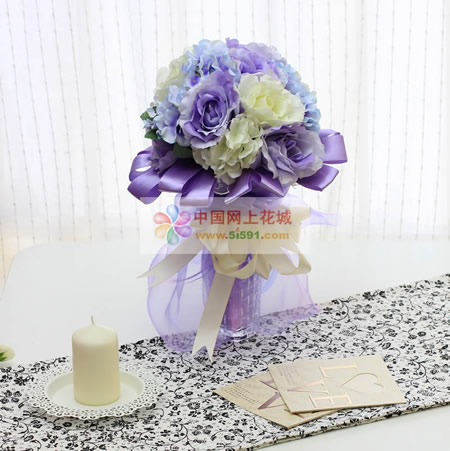 材料包裝: 紫色繡球(仿真花)玫瑰手捧花,采用高仿真材質,手感柔軟,絲帶搭配包裝。整個花束高30CM,直徑28CM左右。