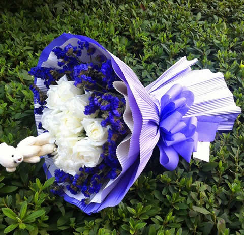 白玫瑰11枝,可愛小熊一只,紫色勿忘我圍邊豐滿;包裝:淡紫色皺紋紙圓形包裝,蝴蝶結