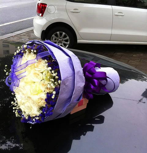 白玫瑰16枝,紫色勿忘我圍邊豐滿;包裝:紫色皺紋紙圓形包裝 花結