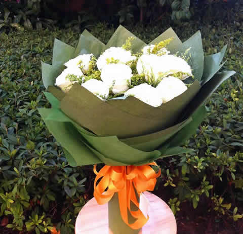 商品簡介:白玫瑰11枝,黃鶯點綴;包裝:皺紋紙圓形包裝